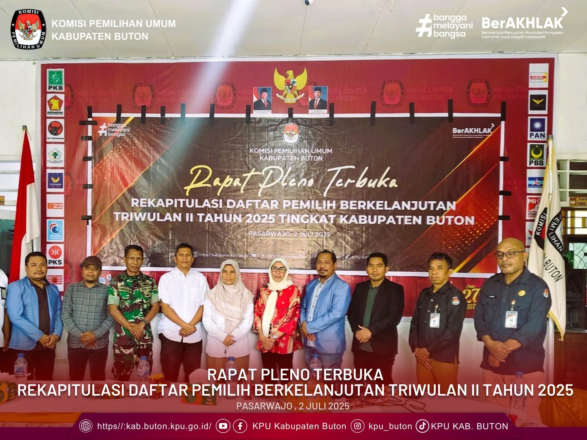 KPU Kabupaten Buton pada hari Rabu, 2 Juli 2025, telah melaksanakan Rapat Pleno Terbuka Rekapitulasi Daftar Pemilih Berkelanjutan (PDPB) Triwulan II Tahun 2025. Rapat berlangsung di Ruang Media Center KPU Kabupaten Buton dengan dihadiri Ketua, Anggota, dan Sekretaris KPU beserta jajaran.