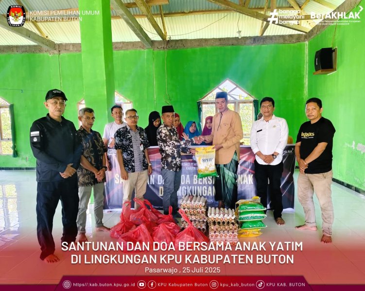Pasarwajo, kab-buton.kpu.go.id - Komisi Pemilihan Umum (KPU) Kabupaten Buton melaksanakan kegiatan Santunan dan Doa Bersama Anak Yatim di Pondok Pesantren Hidayatullah, Kelurahan Wakoko, Kecamatan Pasarwajo, Jumat (25/7/2025). Kegiatan ini merupakan bagian dari aksi serentak yang dilakukan oleh seluruh jajaran KPU se-Indonesia sebagai bentuk kepedulian sosial dan kebersamaan. Dalam kunjungannya, KPU Buton menyerahkan santunan berupa paket sembako kepada anak-anak yatim piatu yang berada di lingkungan pesantren. Penyerahan dilakukan secara langsung oleh Sekretaris KPU Kabupaten Buton, Kamaruddin, mewakili seluruh jajaran sekretariat. Dalam sambutannya, Kamaruddin menyampaikan bahwa kegiatan ini merupakan bentuk kepedulian KPU terhadap lingkungan sosial. Ia juga memohon doa agar seluruh jajaran KPU senantiasa diberikan kesehatan dan kekuatan dalam menjalankan tugas kelembagaan. “Kami hadir dengan penuh ketulusan untuk berbagi dan berharap doa dari adik-adik sekalian serta para pengasuh, agar kami semua diberi kekuatan dalam menjalankan amanah,” ungkapnya. Pengasuh Pondok Pesantren Hidayatullah menyampaikan ucapan terima kasih atas perhatian dan kepedulian yang ditunjukkan oleh KPU Buton. Kegiatan ditutup dengan doa bersama, penuh harap agar kebaikan dan keberkahan bulan Muharram selalu menyertai. Melalui kegiatan ini, KPU Kabupaten Buton menegaskan komitmennya untuk terus menjalin kedekatan dengan masyarakat sekitar dan menumbuhkan semangat kebersamaan dalam setiap langkah pelayanan publik.(Adm/DS) La Ode Yusran Syarif