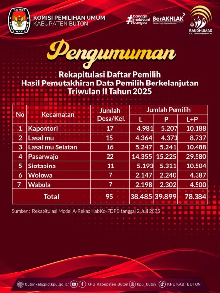 KPU Kabupaten Buton pada hari Rabu, 2 Juli 2025, telah melaksanakan Rapat Pleno Terbuka Rekapitulasi Daftar Pemilih Berkelanjutan (PDPB) Triwulan II Tahun 2025. Rapat berlangsung di Ruang Media Center KPU Kabupaten Buton dengan dihadiri Ketua, Anggota, dan Sekretaris KPU beserta jajaran. Selain internal KPU, hadir pula perwakilan undangan dari Bawaslu Kabupaten Buton, Polres Buton, Kodim 1413/Buton, serta Dinas Kependudukan dan Pencatatan Sipil (Disdukcapil) Kabupaten Buton sebagai bagian dari koordinasi bersama dalam memastikan validitas data pemilih. Adapun hasil rekapitulasi PDPB Triwulan II Tahun 2025 di Kabupaten Buton adalah sebagai berikut: Jumlah Pemilih Laki-laki : 38.485 Jumlah Pemilih Perempuan : 39.899 Total Pemilih : 78.384 Berdasarkan hasil tersebut, KPU Kabupaten Buton telah menetapkan Keputusan Nomor 18 Tahun 2025 tentang Rekapitulasi Pemutakhiran Data Pemilih Berkelanjutan Tingkat Kabupaten Buton Tahun 2025 Triwulan II. (Adm/DS) Salinan keputusan dapat diunduh melalui tautan berikut: Keputusan KPU Buton No 18 Tahun 2025 La Ode Yusran Syarif